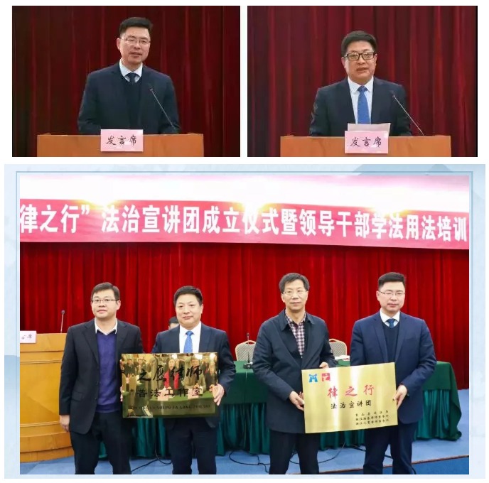浙江海泰律师事务所主任邬辉林律师作为宣讲团律师代表进行表态发言,并接受罗部长的授牌。浙江之鹰律师事务所主任张西平律师则作为之鹰律师普法工作室的代表进行表态发言,并接受穆锦斌副县长的授牌。