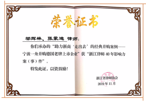 为进一步总结案例经验,深度挖掘国内企业、宁波本土企业在面临境外投资、并购时的痛点、难点问题,与业界更多的同仁分享,邬辉林律师将该案例撰写成了实务论文《民企境外并购项目的律师实务研究——兼论国内律师承办境外并购业务的角色定位与市场运作》,并获得了首届浙江律师论坛论文一等奖、第九届华东律师论坛优秀论文二等奖。