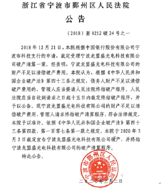宁波龙盟盛光电有限公司破产清算程序终结公告