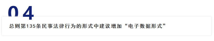 第135条规定民事法律行为可以采用书面形式、口头形式或者其他形式;法律、行政法规规定或者当事人约定采用特定形式的,应当采用特定形式。虽然有其他形式的兜底条款,但鉴于电子数据形式的普及化,新修订的诉讼法均规定了电子数据证据。故建议135条修改为民事法律行为可以采用书面形式、口头形式、电子数据形式或者其他形式;法律、行政法规规定或者当事人约定采用特定形式的,应当采用特定形式。民法典草案第469条第3款规定“以电报、电传、传真、电子数据交换、电子邮件等方式能够有形地表现所载内容,并可以随时调取查用的数据电文,视为书面形式。”如果数据电文视为书面形式,那么该条款应该在总则民事法律行为的形式中予以规定,而不能规定分则的合同法中。
