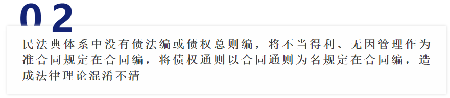在法律界众所周知,物权是绝对权、对世权,债权是相对权,对人权。债的发生原因分为合同、侵权行为、不当得利、无因管理等。合同是约定之债,侵权行为、不当得利、无因管理是法定之债。而现在的民法典草案的编章结构中看不到任何债权的文字。虽然在总则民事权利章第118条规定“民事主体依法享有债权。债权是因合同、侵权行为、无因管理、不当得利以及法律的其他规定,权利人请求特定义务人为或者不为一定行为的权利。”但又在合同编中设置第三分编准合同,下设第28章无因管理,第29章不当得利。那么无因管理、不当得利到底是与合同并列的债权发生原因还是合同中的准合同,自相矛盾。此外,债权的保全、债的履行、债的变更和转让、债的消灭等都变成了合同保全、合同的履行、合同的变更和转让、合同的权利义务终止等,这些将债权与合同混为一谈的作法,在法律上是很不严谨的。