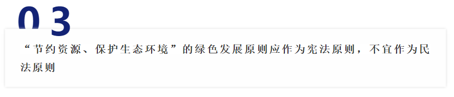 民法典草案第9条规定“民事主体从事民事活动,应当有利于节约资源、保护生态环境”的绿色发展原则其实是宪法原则,不仅是民事活动,其他的诸如政治、军事、外交、行政决策、行政行为均应遵循绿色发展原则。因此,将宪法原则纳入到民法典中有点突兀,与民法的个性原则平等、自愿、公平、诚信、公序良俗原则格格不入。