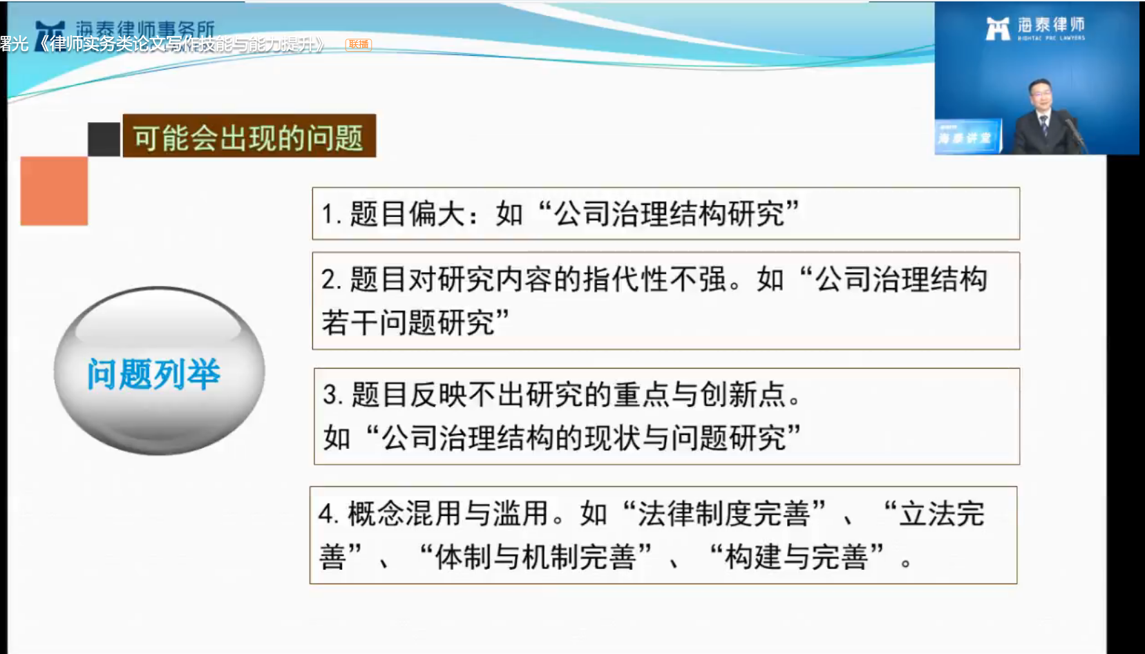 这次讲座,他从五个方面讲解了律师实务类论文写作的基本技能:一、律师实务类论文的写作特色;二、律师实务类论文的构思与选题;三、律师实务类论文的分析构架搭建;四、律师实务类论文的学术规范遵守;五、律师实务类论文的研究方法运用。