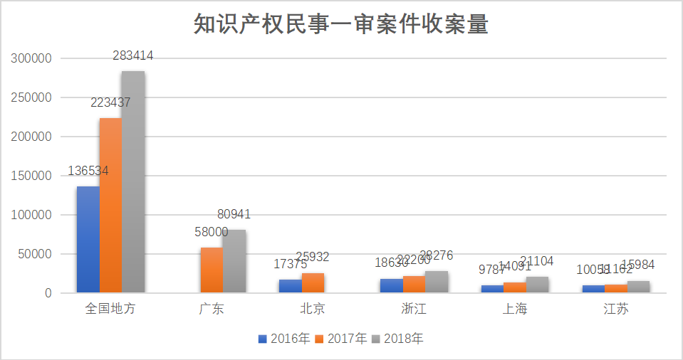 从上图可以看出,全国地方法院受理的知识产权民事一审案件2017年相当于2016年递增63.65%,2018年相对于2017年递增26.84%;广东法院2018年相对于2017年递增39.55%;北京法院2017年相对于2016年递增49.25%;浙江法院2017年相对于2016年递增19.16%,2018年相对于2017年递增27.37%;江苏法院2017年相对于2016年递增10.98%,2018年相对于2017年递增43.20%;上海法院2017年相对于2016年递增43.98%,2018年相对于2017年递增49.77%。通过对上述数据进行平均,其平均增长率为37.38%。