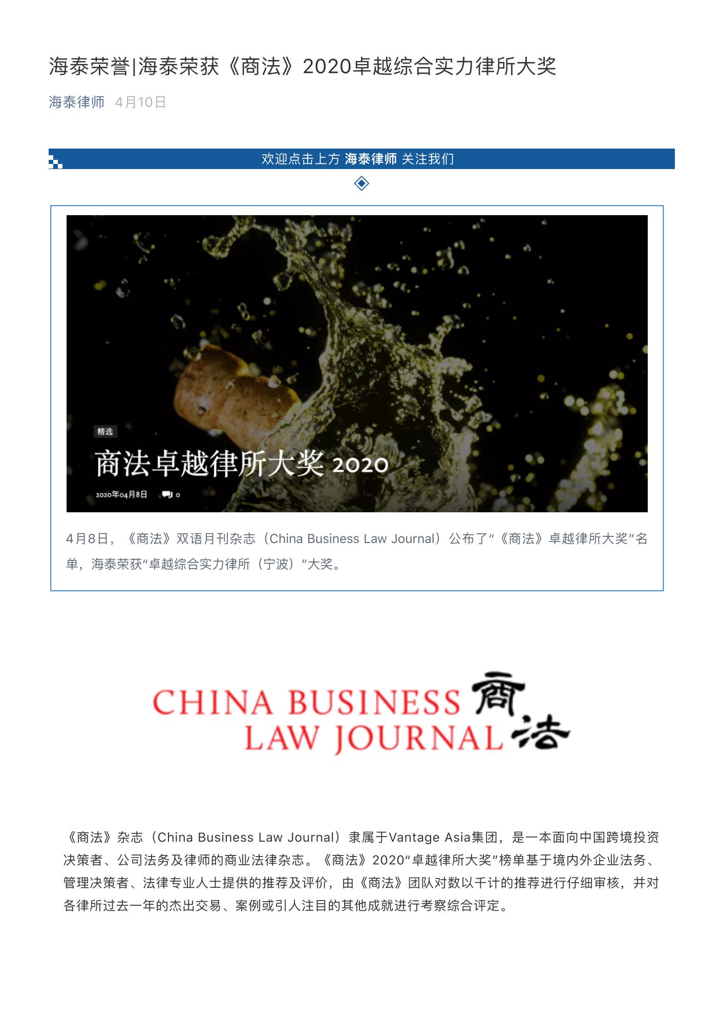 海泰荣获《商法》“2020卓越综合实力(宁波)”大奖