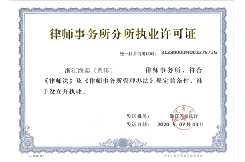 2020年5月,海泰所喜获国家知识产权局核发的《专利代理机构执业许可证》,成为宁波市第二家同时具有律师执业和专利代理资质的律师事务所,具备代理全部知识产权申请、诉讼、非诉讼业务的资质。