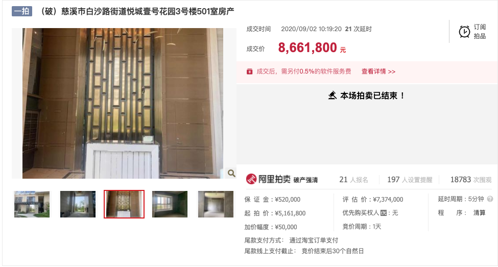 3号楼501室以起拍价5161800元,评估价7374000元,成交价8661800元竞拍成功,单价22674.86元/㎡。