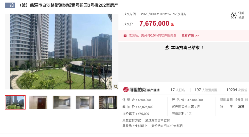3号楼202室以起拍价5026000元,评估价7180000元,成交价7676000元竞拍成功,单价20094.24元/㎡。