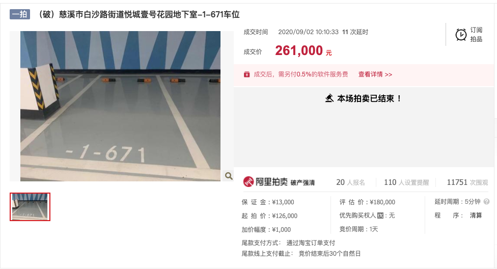 -1-671车位以起拍价126000元,评估价180000元,成交价261000元竞拍成功。