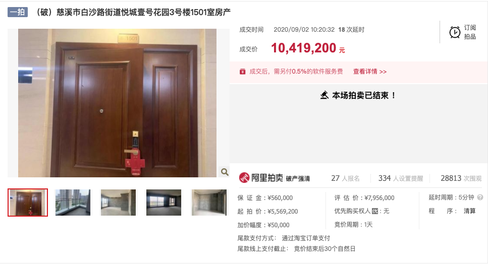 2020年9月2日上午10时,恒元置业(慈溪)有限公司开发的“悦城壹号花园”项目5套存量房及1个地下车位在淘宝网司法拍卖平台拍卖成交,合计成交金额达40302800元。浙江海泰律师事务所作为恒元置业(慈溪)有限公司的破产管理人,本着勤勉尽责,忠实执行职务的原则,依法对债务人财产进行审核并经第三方评估机构进行评估后进行网上挂拍。