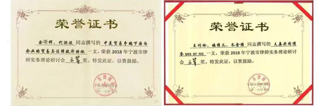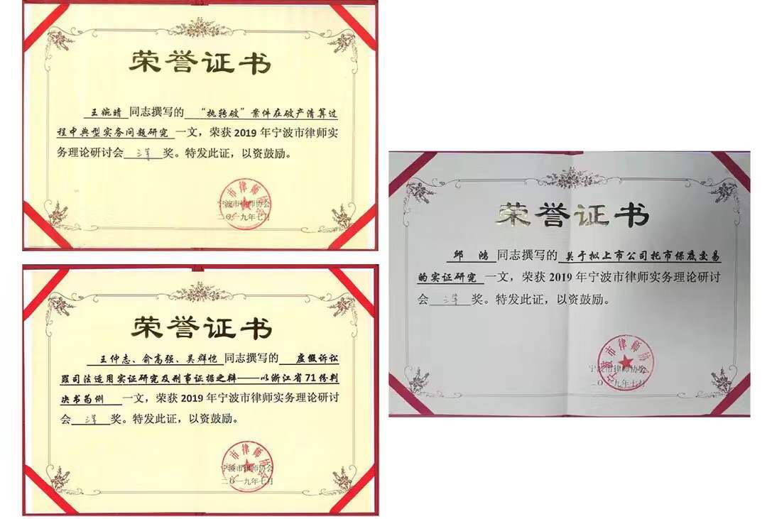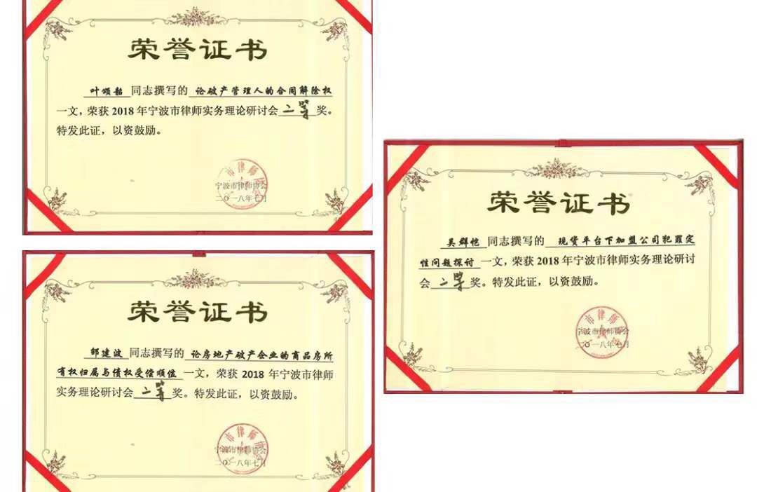 海泰秉承“专业成就价值”的理念,务实笃行,精研法理,始终坚持理论与实务并重,注重理论学习与研究,多年来撰写的论文在华东律师论坛、浙江律师论坛及长三角洲法学论坛上均取得了良好的成绩,尤其是宁波市律师实务理论研讨论坛所提交论文的数量、入围量、获奖量均位列前茅,连续四年蝉联宁波市律师实务理论研讨一等奖,彰显海泰律师理论实务实力。