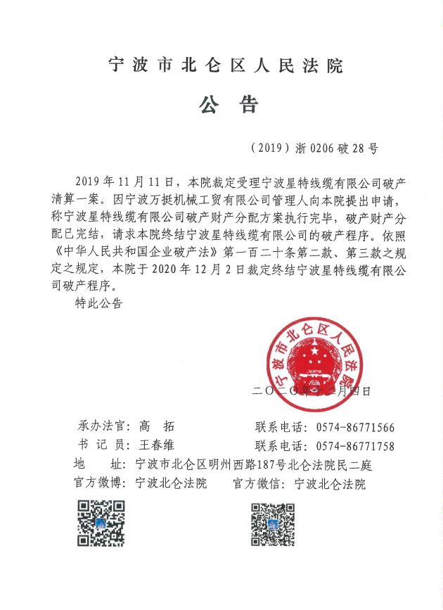 宁波星特线缆有限公司破产程序终结公告
