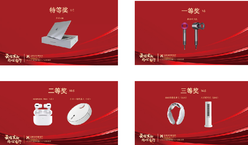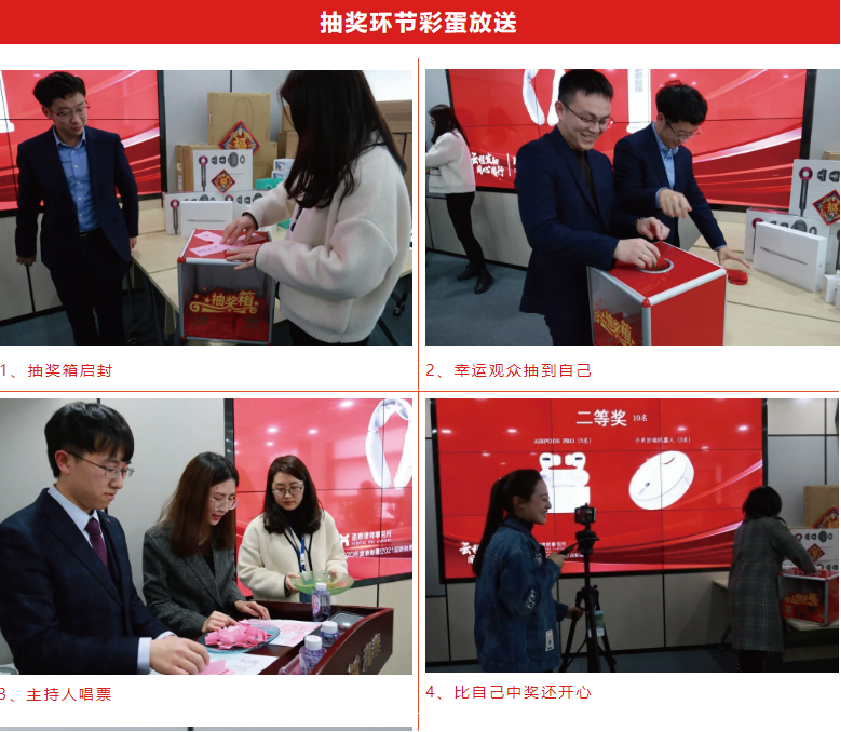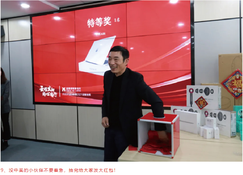 盼望着,盼望着,最激动人心的的抽奖环节来了!尽管年会仪式从简,但此次奖品含金量媲美往年,绝不含糊,奖品多达50份,涵盖苹果Air、戴森吹风机、Airpods Pro、小米扫地机器人、SKG颈椎按摩仪、米家暖风机、米家挂烫机等。现场更是一连数次追加了诱人的线上红包抽奖环节,将现场氛围推向了高潮,欢呼的叫声一浪高过一浪。