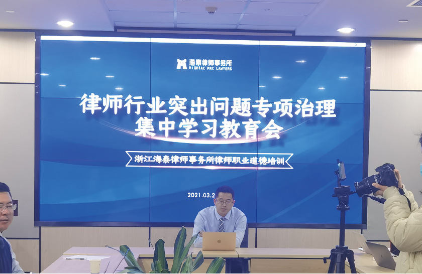 为贯彻落实中央和省委、市委关于政法队伍教育整顿工作和党史学习教育的部署要求,响应市司法局律师行业突出问题专项治理活动的号召,3月25日晚,海泰律师事务所召开律师行业突出问题专项治理集中学习教育会,我所主任邬辉林和党总支书记徐文涛主持会议,会议采取线上线下同步直播的形式开展,全所律师参与学习。