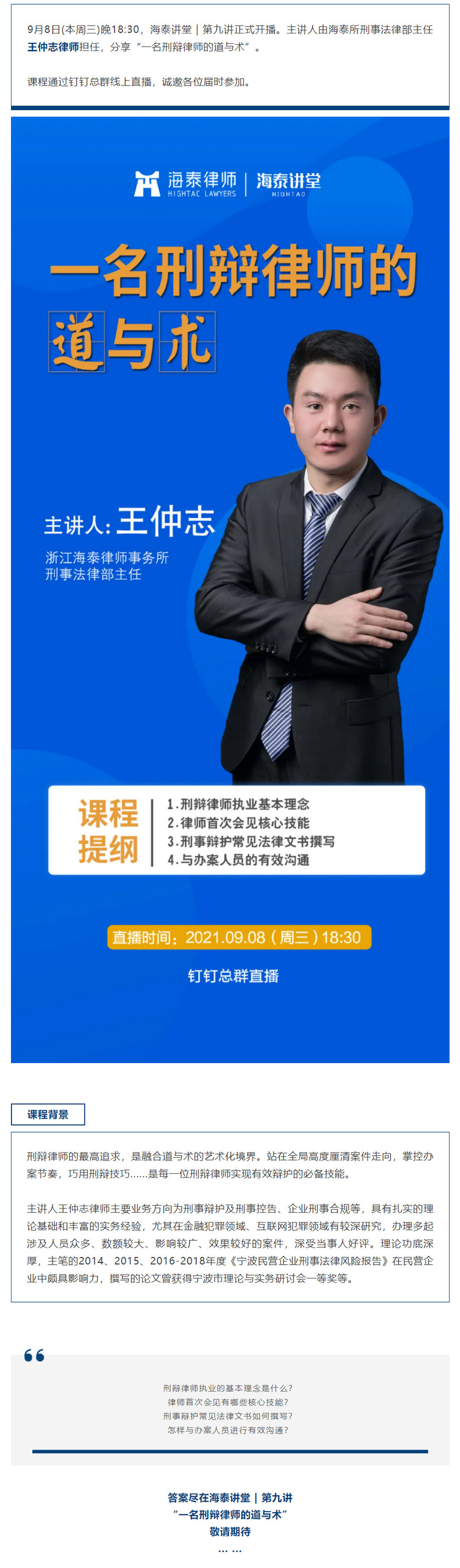 海泰讲堂·预告 | 王仲志律师分享“一名刑辩律师的道与术”