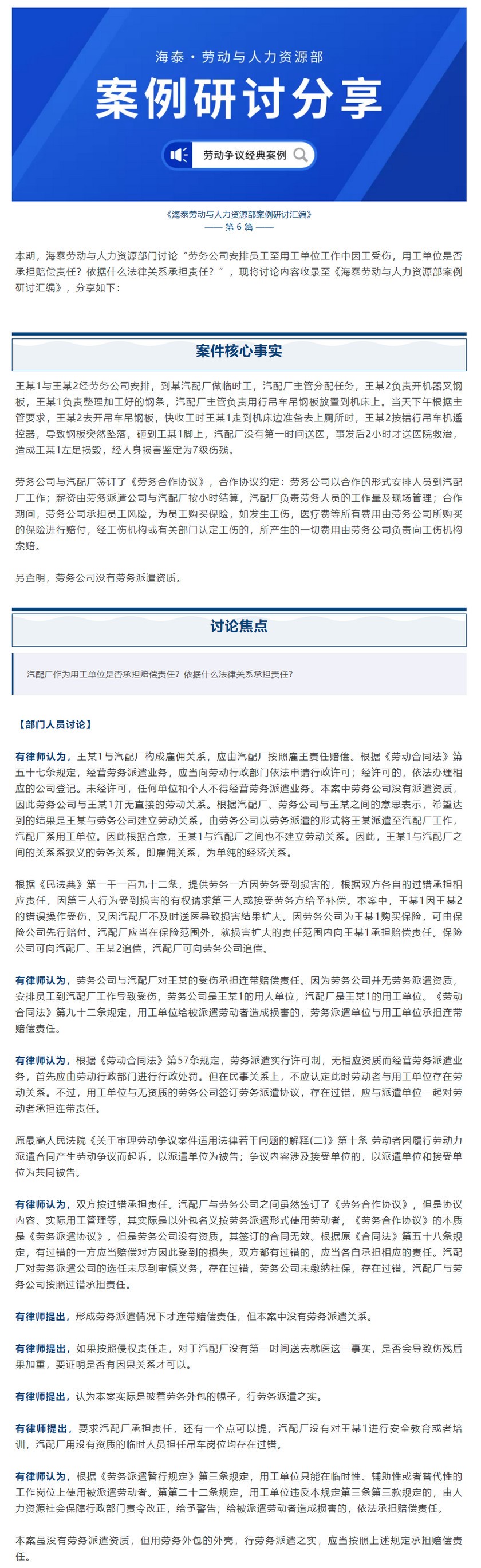 劳务公司安排员工至用工单位工作中因工受伤,用工单位是否承担赔偿责任?| 海泰劳动与人力资源部案例研讨汇编⑥
