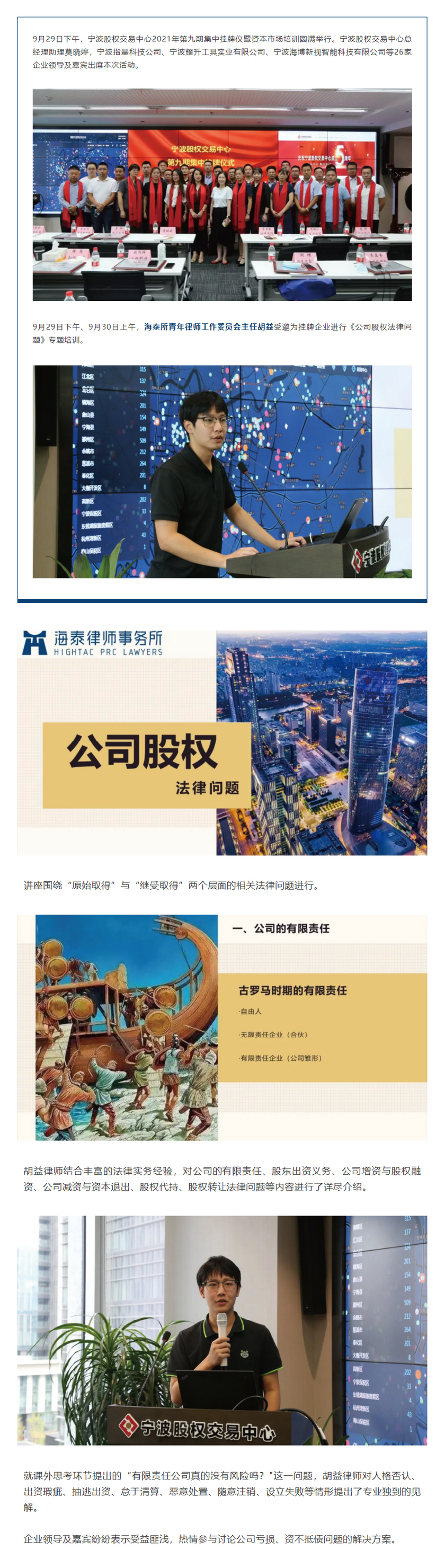 胡益律师受邀为宁波股权交易中心2021年第九期集中挂牌企业授课 | 海泰简讯