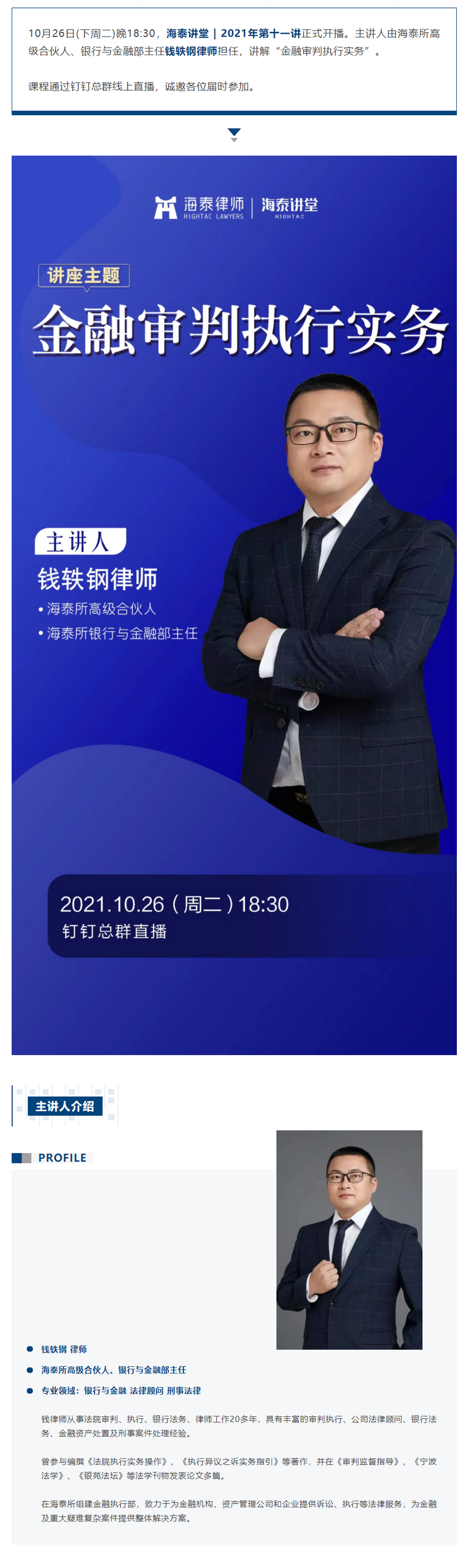 海泰讲堂·预告 | 钱轶钢律师讲解“金融审判执行实务”