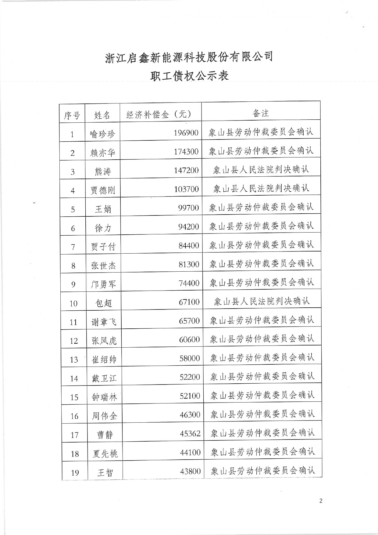 浙江启鑫新能源科技股份有限公司职工债权公示