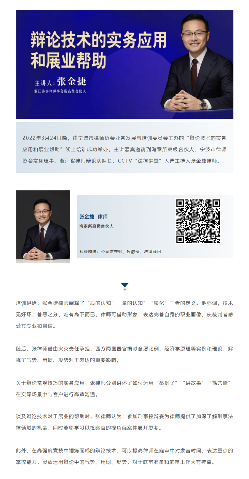 张金捷律师面向宁波市律师分享“辩论技术的实务应用和展业帮助” | 海泰简讯