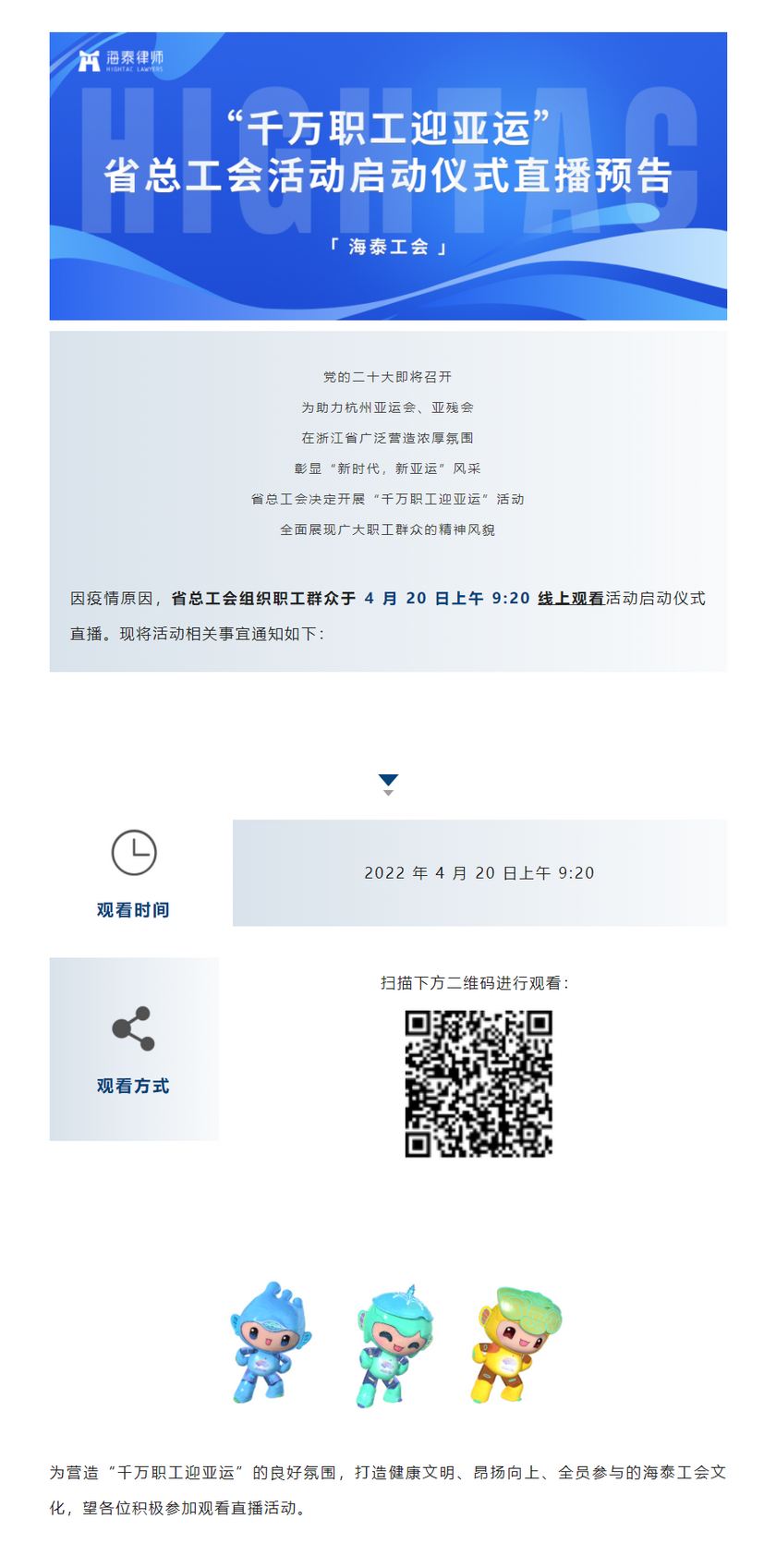 “千万职工迎亚运”浙江省总工会活动启动仪式直播预告 | 海泰工会