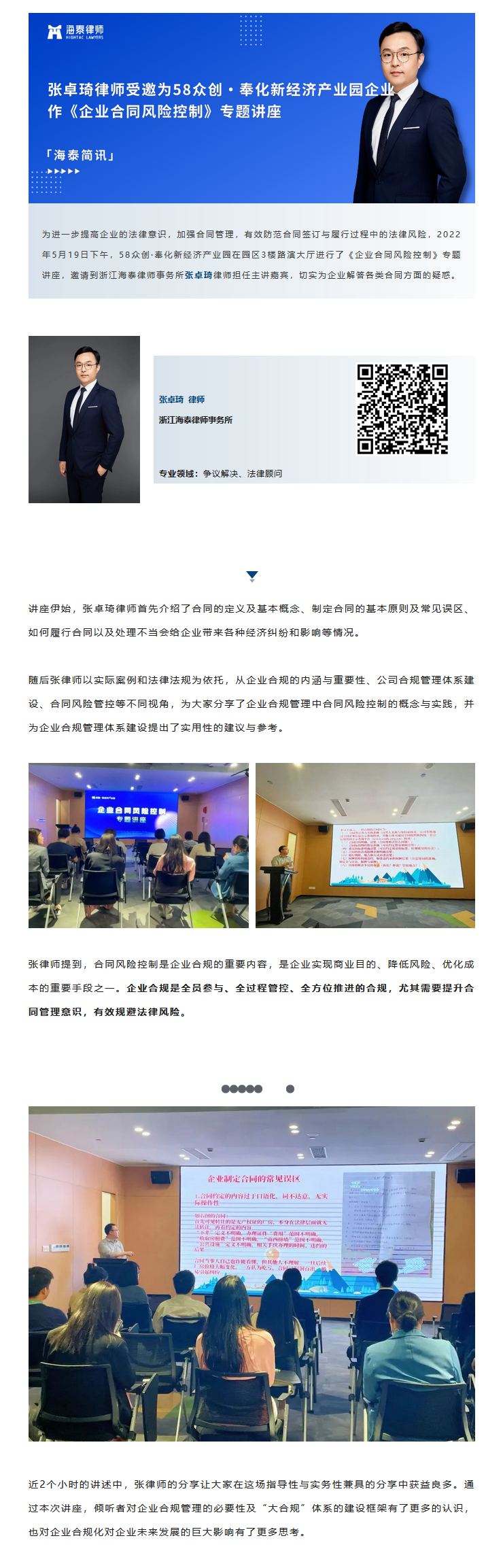 张卓琦律师受邀为58众创·奉化新经济产业园企业作《企业合同风险控制》专题讲座 | 海泰简讯