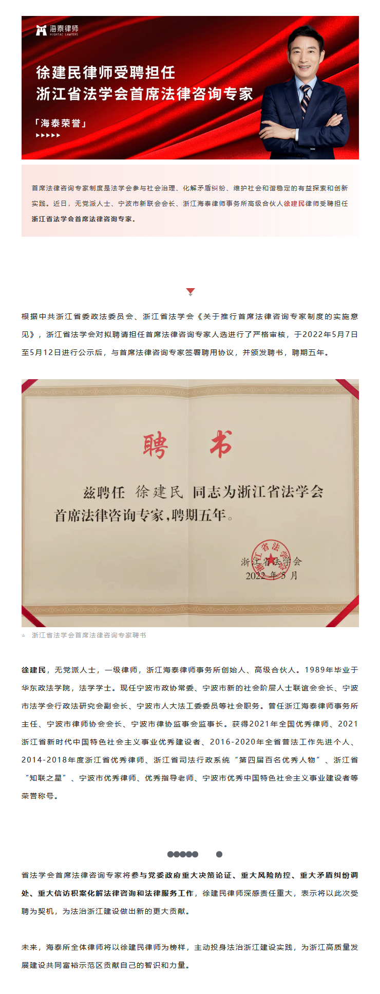 徐建民律师受聘担任浙江省法学会首席法律咨询专家 | 海泰荣誉