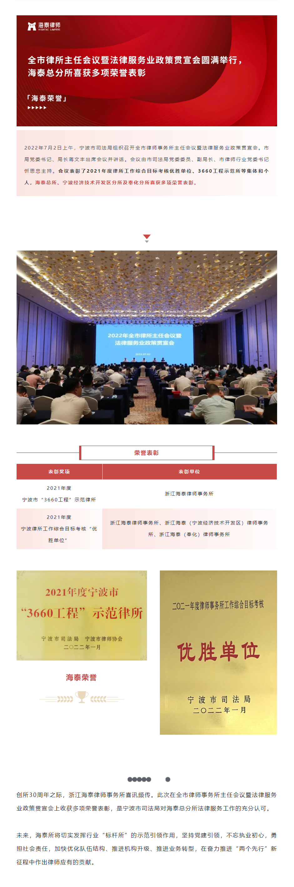 全市律所主任会议暨法律服务业政策贯宣会圆满举行,海泰总分所喜获多项荣誉表彰 | 海泰荣誉