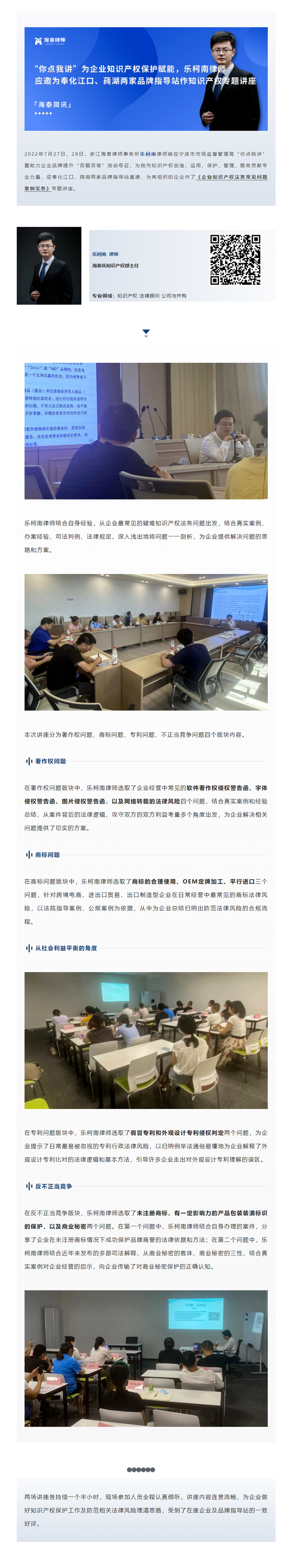 “你点我讲”为企业知识产权保护赋能 | 乐柯南律师应邀为奉化江口、莼湖两家品牌指导站作知识产权专题讲座