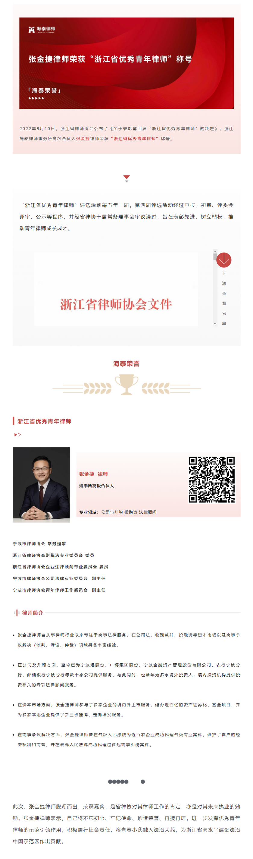 张金捷律师荣获“浙江省优秀青年律师”称号 | 海泰荣誉