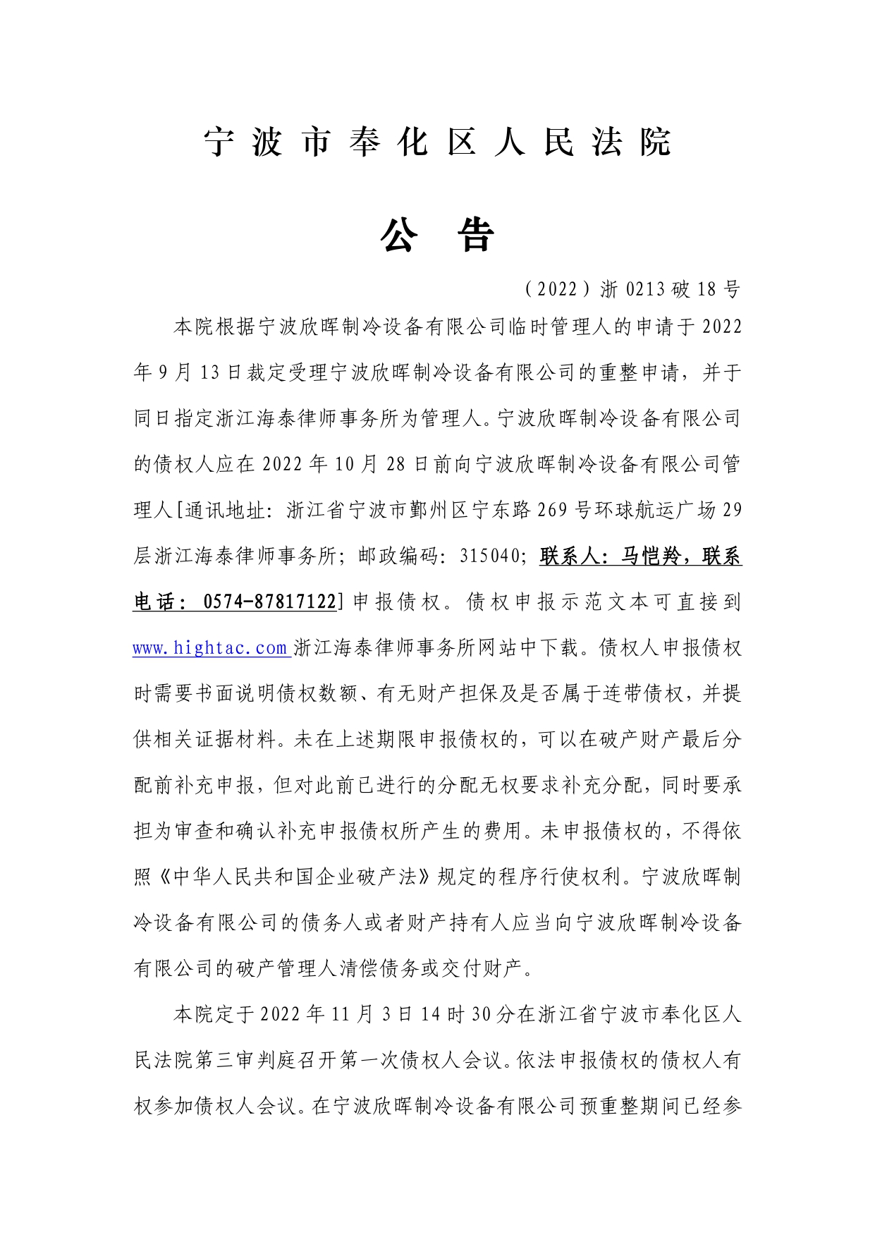 欣晖重整第一次债权人会议公告