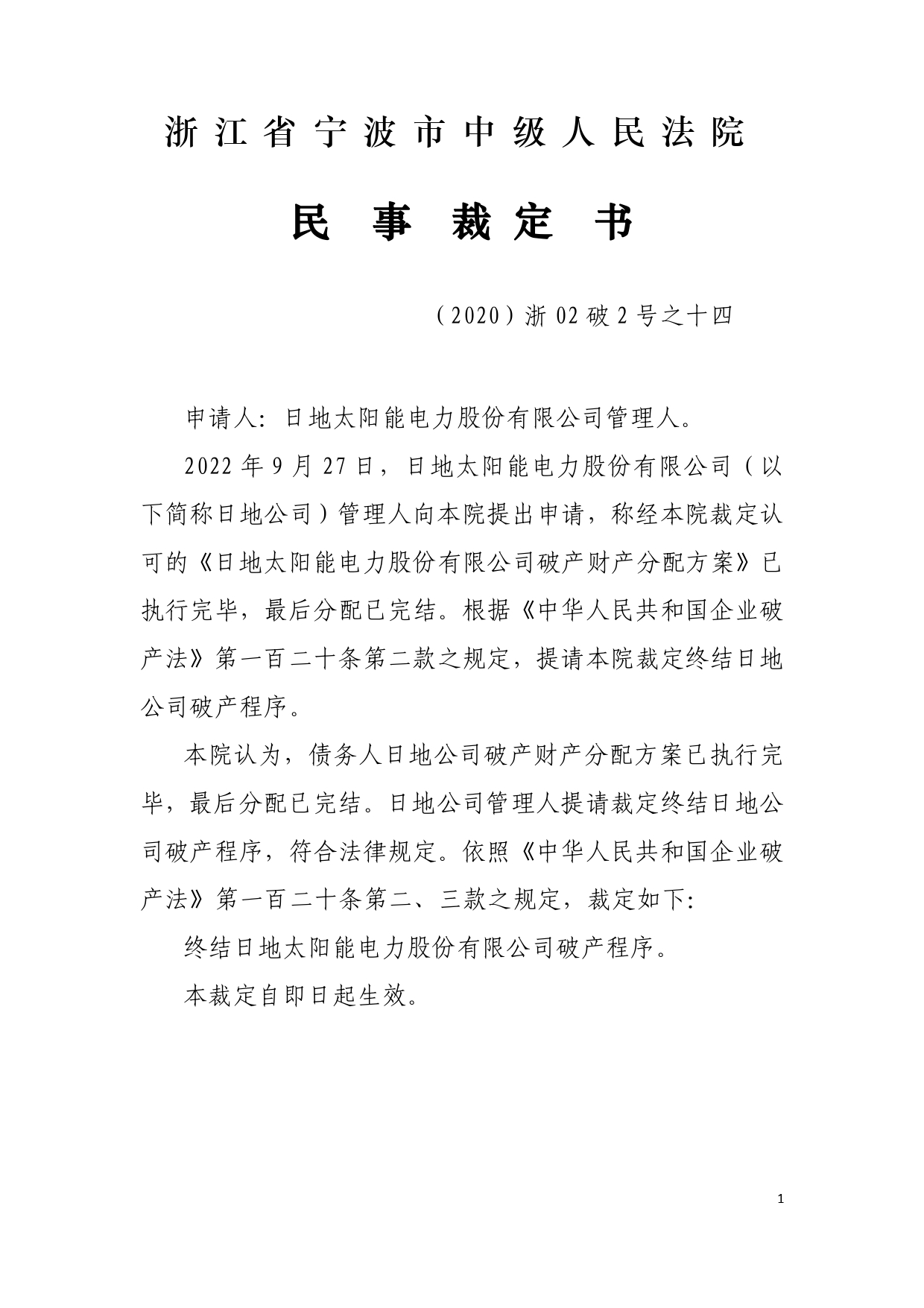 日地太阳能电力股份有限公司破产程序终结裁定