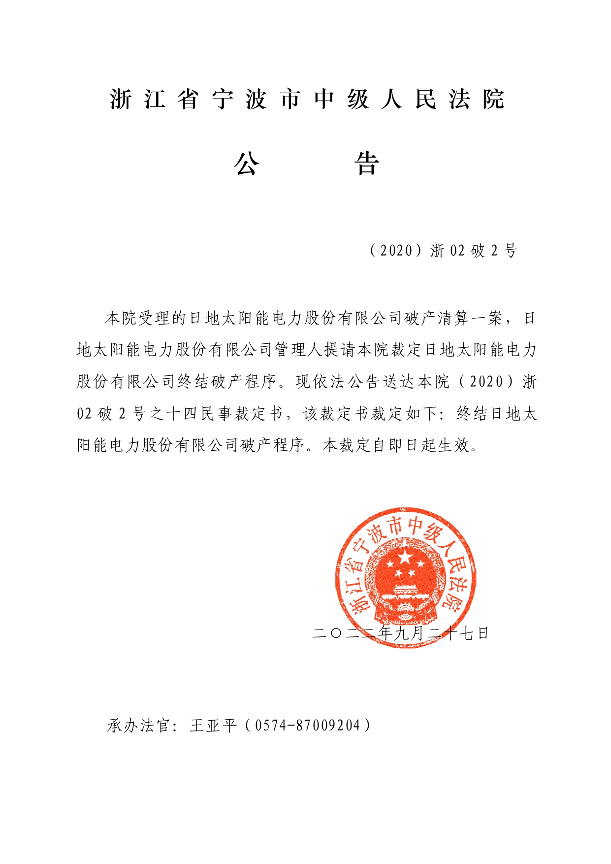 日地太阳能电力股份有限公司破产程序终结公告