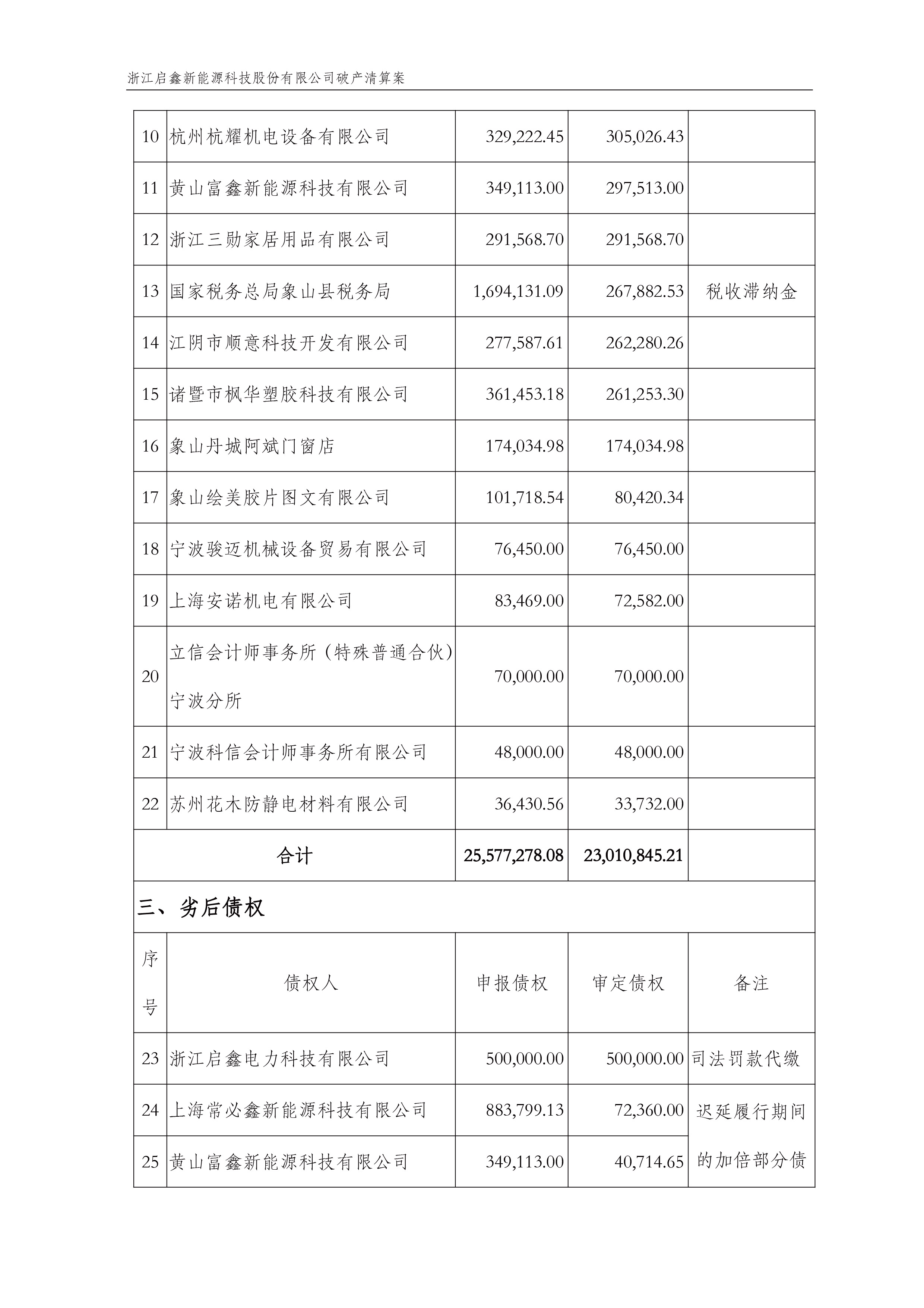 2022年1月21日,浙江启鑫新能源科技股份有限公司破产清算案已召开第一次债权人会议,浙江启鑫新能源科技股份有限公司管理人已编制债权表并记载在会议资料中,供全体债权人核查。会后,管理人陆续收到一些补充债权申报和债权异议。经审核,管理人将补充申报的债权审核结果、债权异议后存在调整的债权编制成债权表(二),现予以公示,供全体债权人核查。
