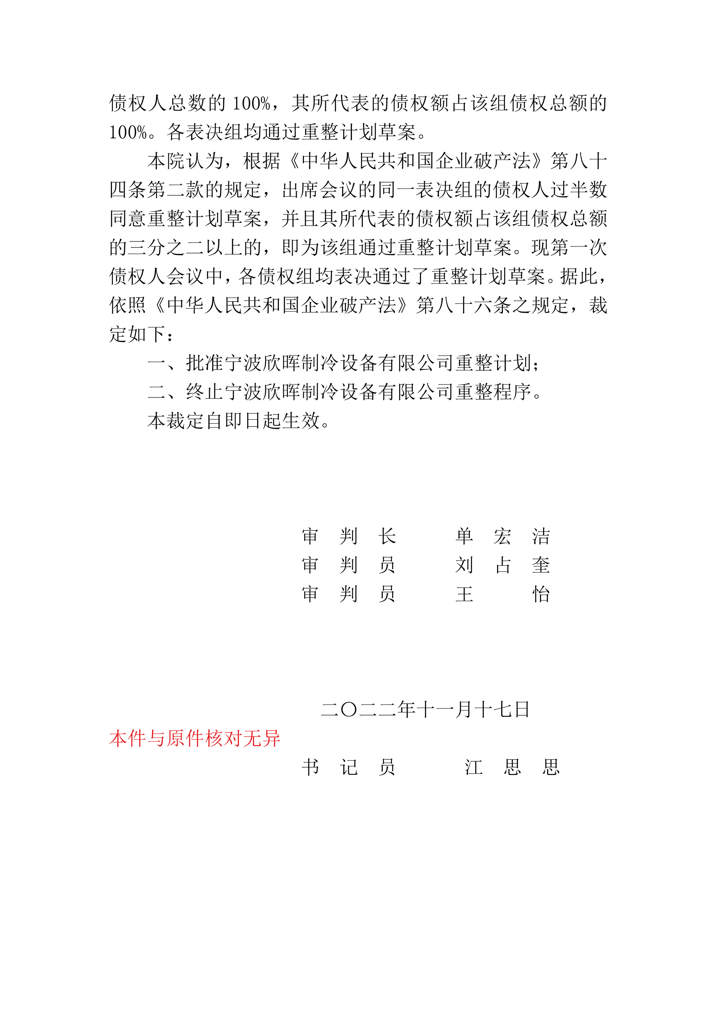 宁波欣晖制冷设备有限公司批准重整方案公告