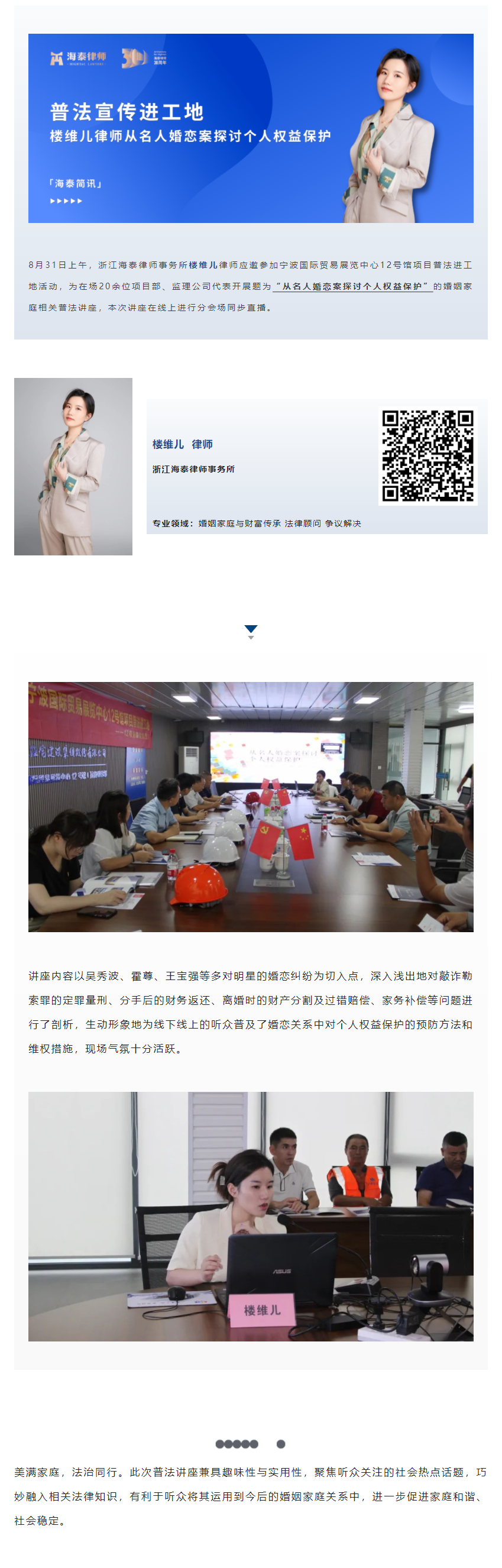普法宣传进工地,楼维儿律师从名人婚恋案探讨个人权益保护 | 海泰简讯