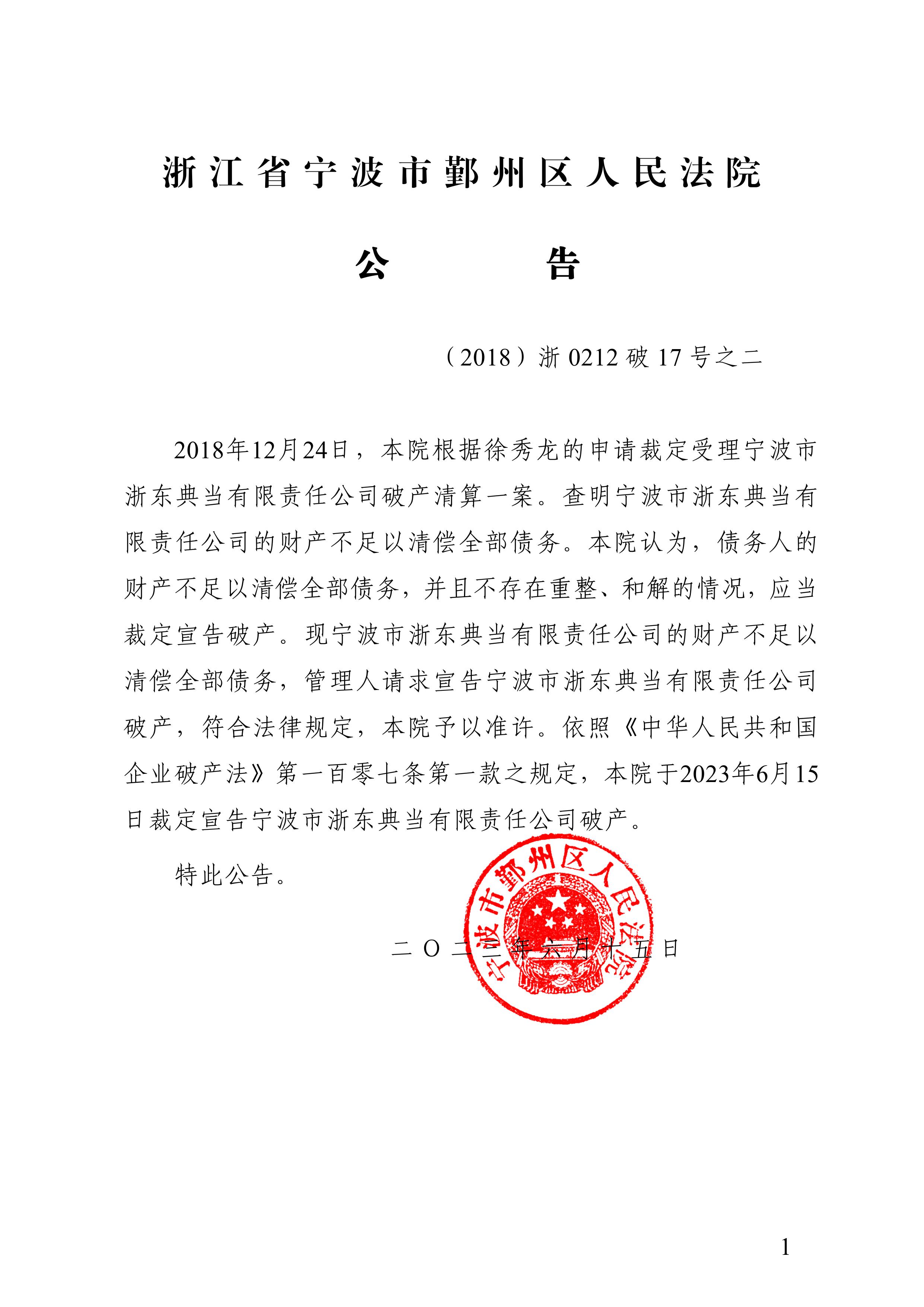 宁波市浙东典当有限责任公司宣告破产公告