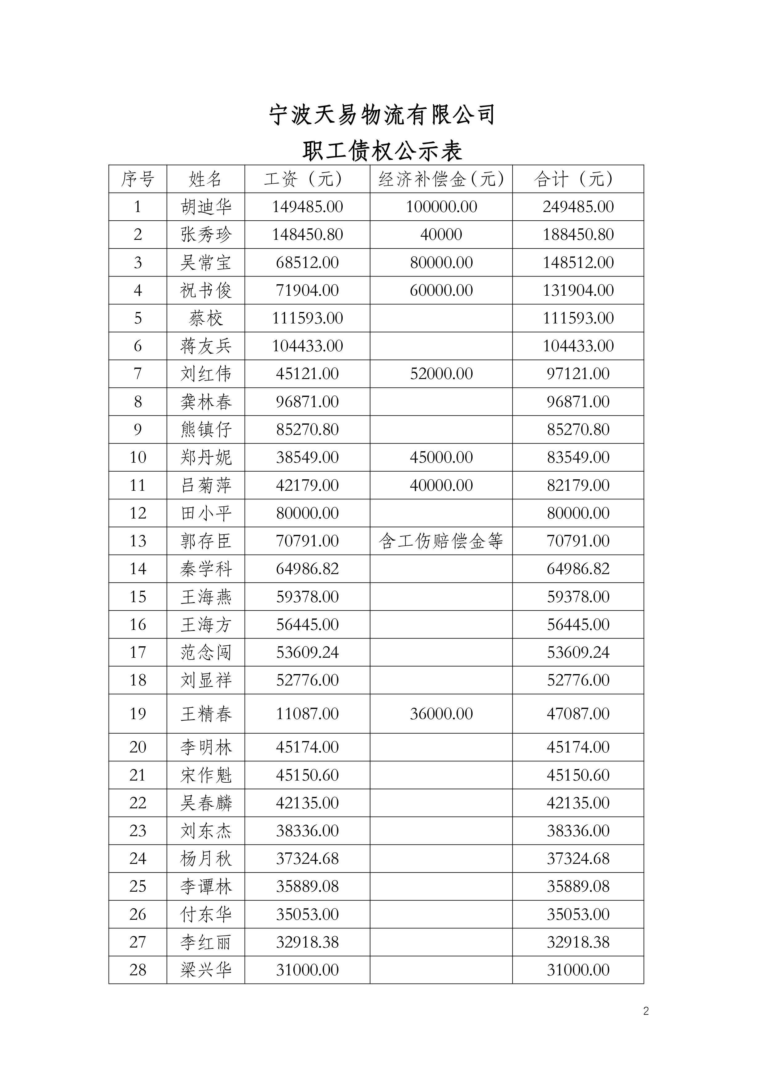 宁波天易物流有限公司职工债权公示