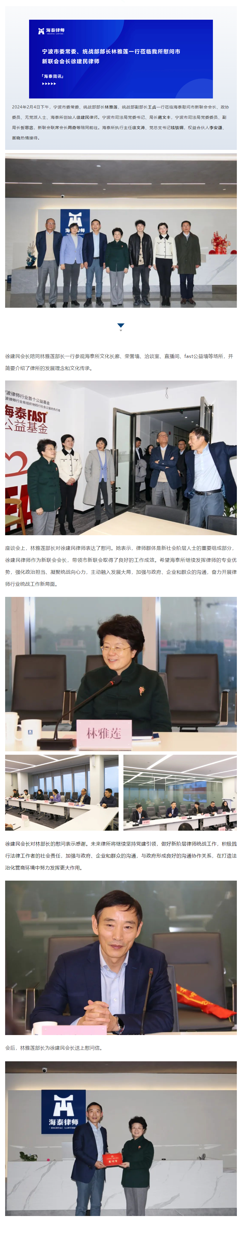 宁波市委常委、统战部部长林雅莲一行莅临我所慰问市新联会会长徐建民律师