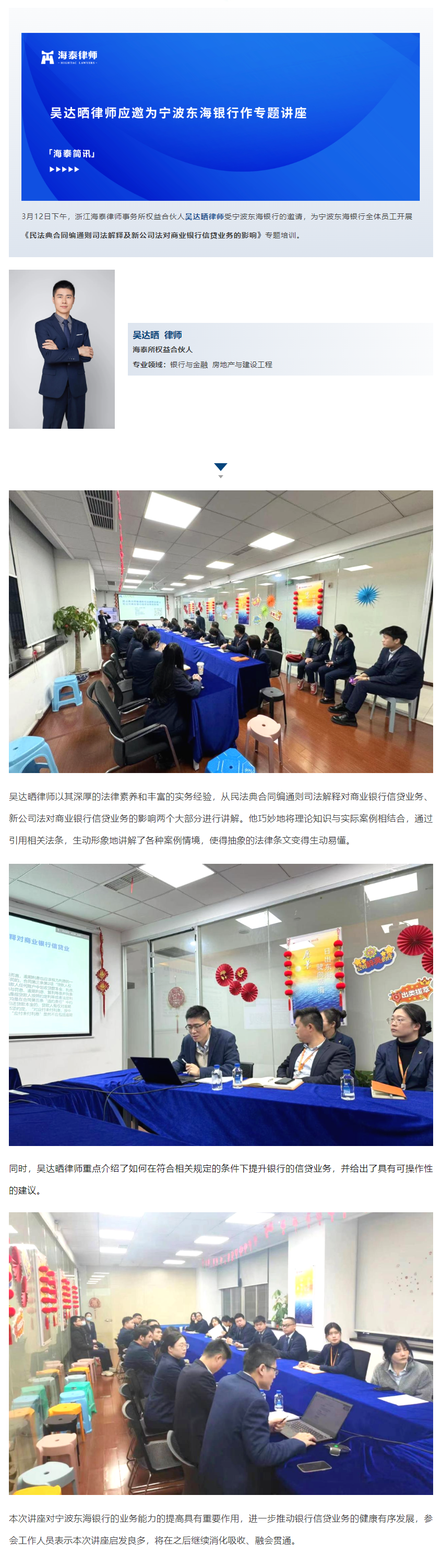 吴达晒律师应邀为宁波东海银行作专题讲座丨海泰简讯