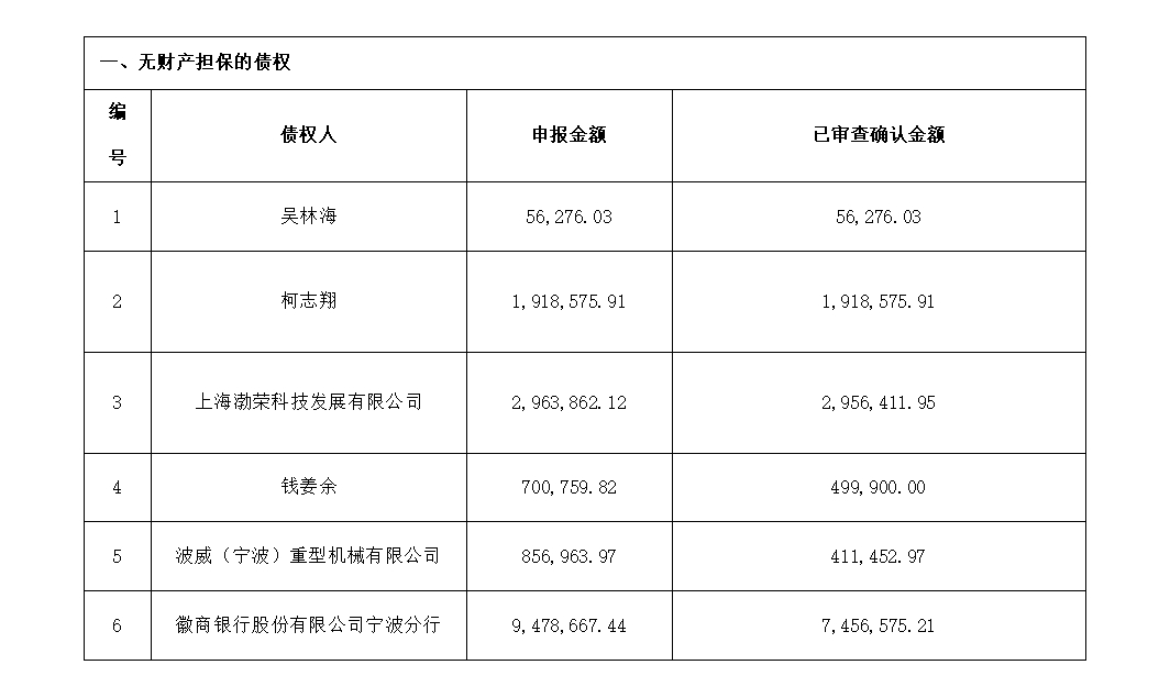 债权人:波威(宁波)重型机械有限公司,审定债权本金411,452.97元,债权性质为普通债权。