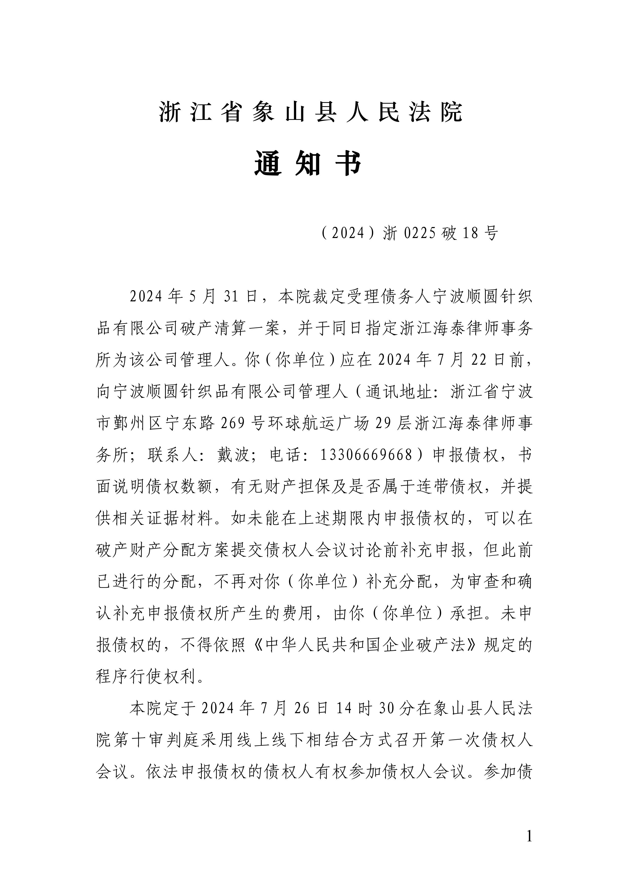 宁波顺圆针织品有限公司破产公告