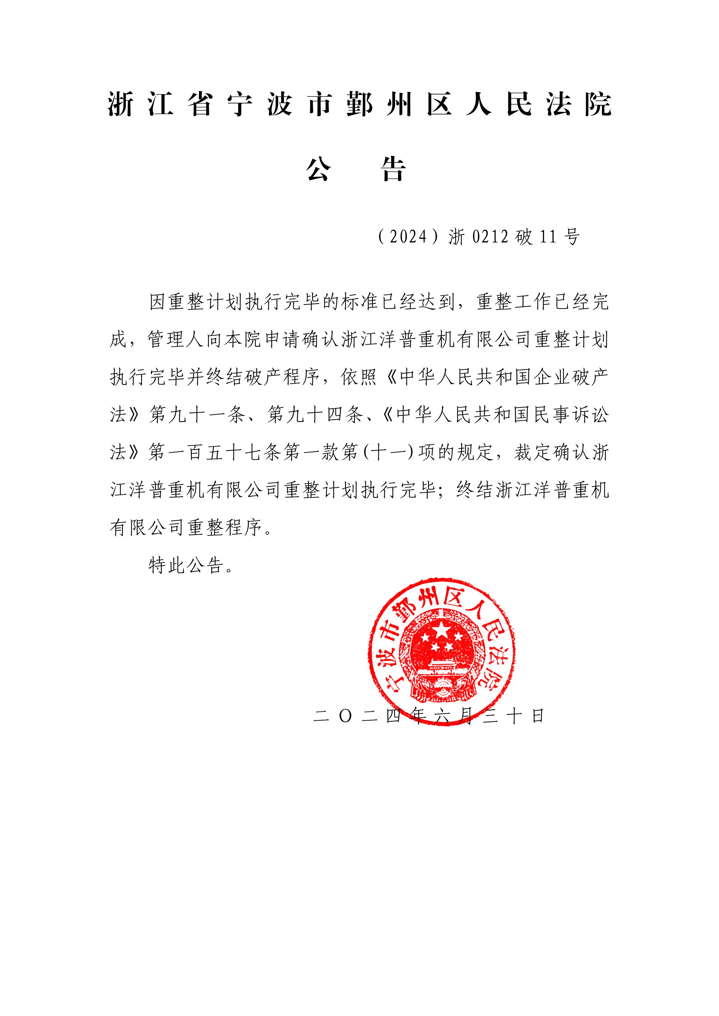 浙江洋普重机有限公司重整终结公告