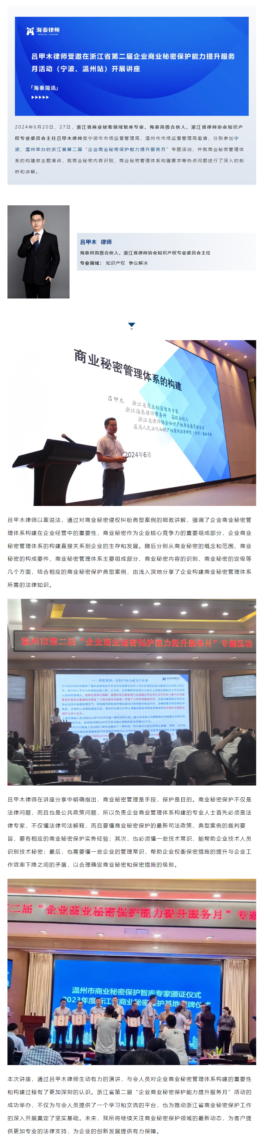 吕甲木律师受邀在浙江省第二届企业商业秘密保护能力提升服务月活动(宁波、温州站)开展讲座