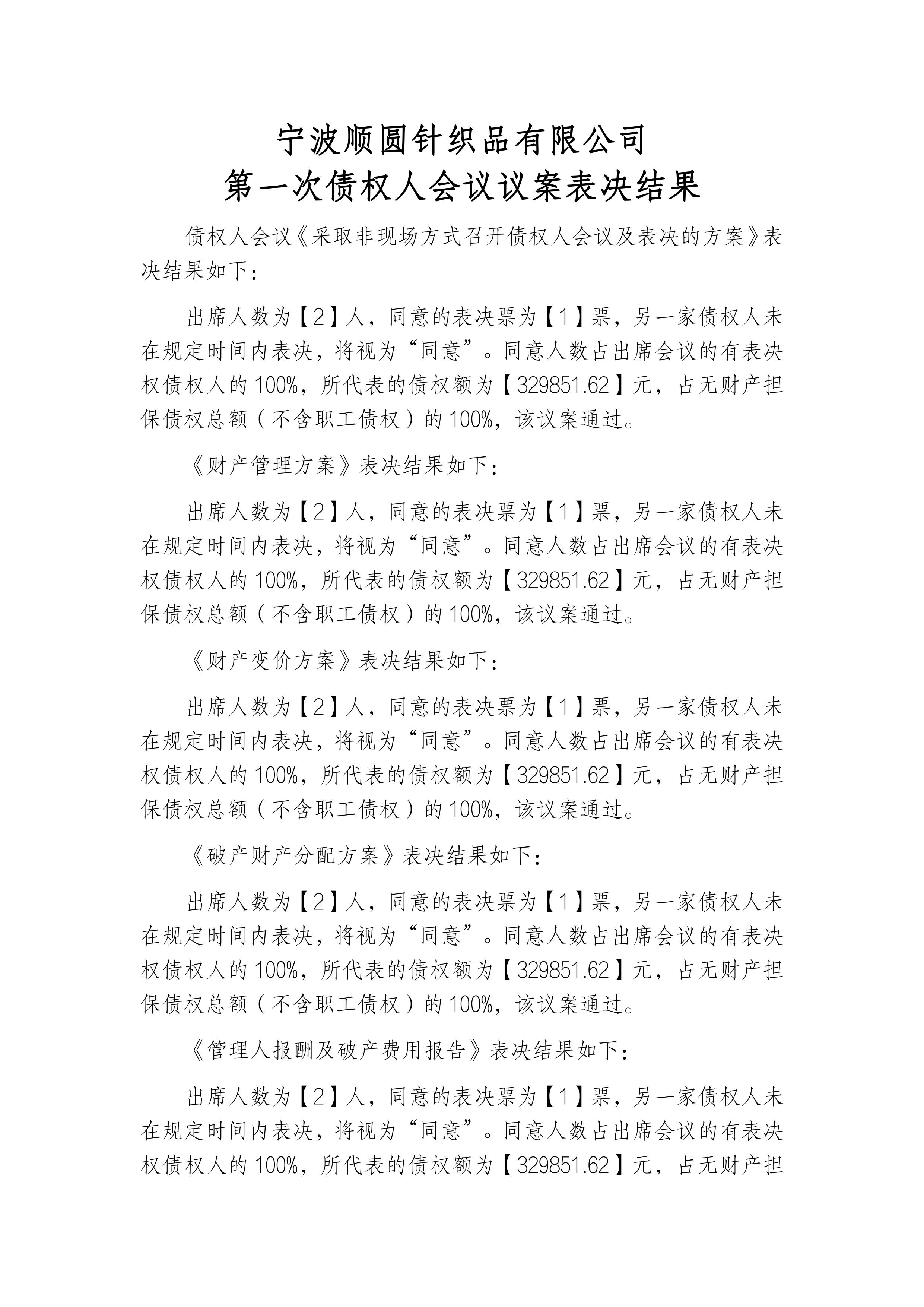 宁波顺圆针织品有限公司第一次债权人会议议案表决结果