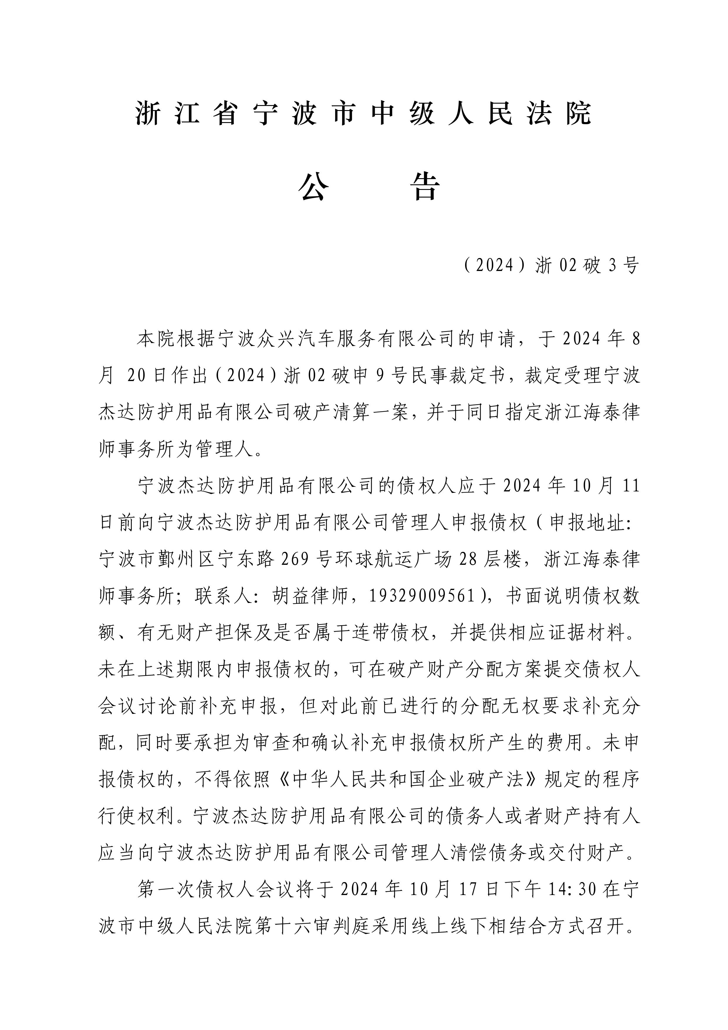 宁波杰达防护用品有限公司破产清算案债权申报公告