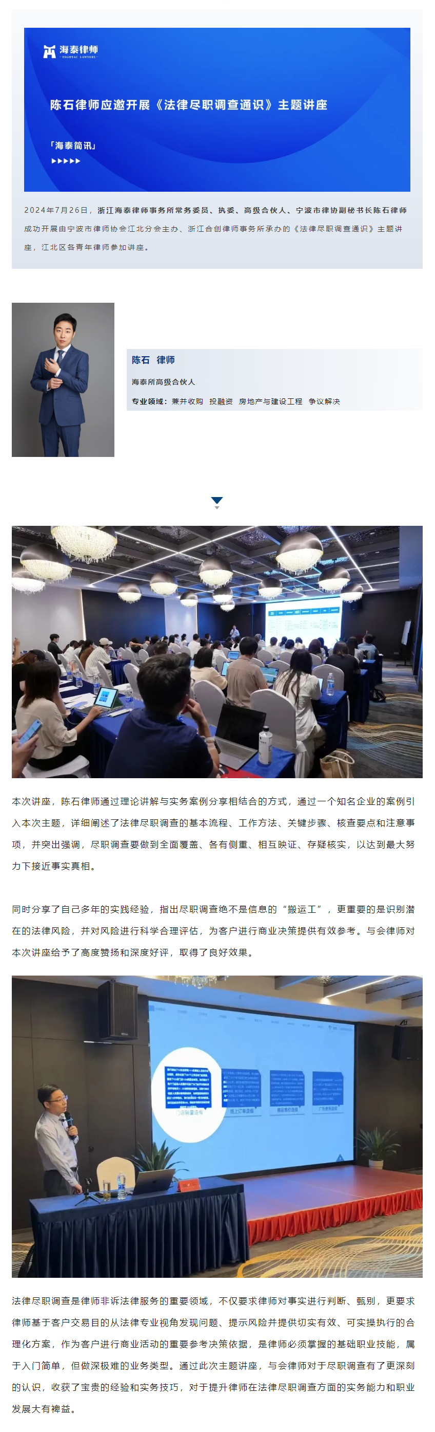 陈石律师应邀开展《法律尽职调查通识》主题讲座 | 海泰简讯