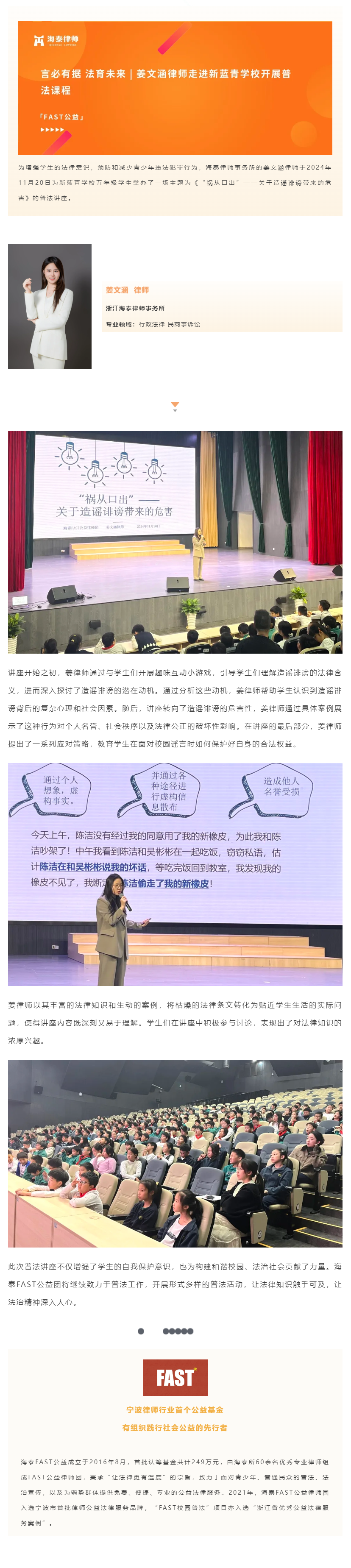 言必有据 法育未来 | 姜文涵律师走进新蓝青学校开展普法课程