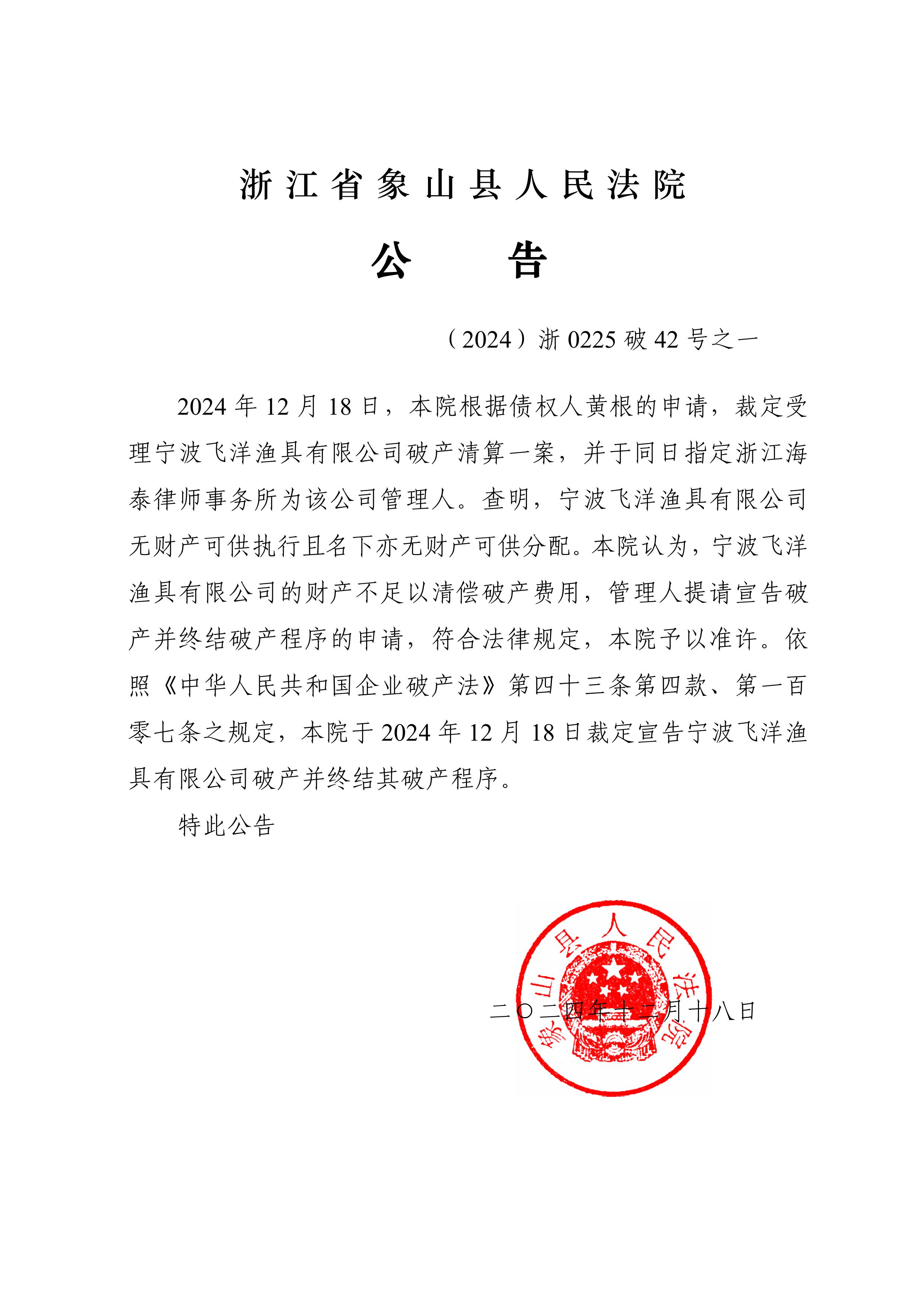 宁波飞洋渔具有限公司破产程序终结公告