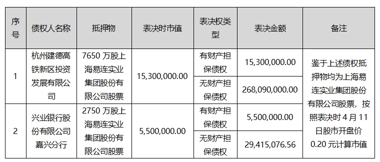 出席会议有表决权的债权人人数共计 2 人, 2 人同意,同意人数占出席会议有表决权人数的比例为 100.0 %。同意人数所代表的无财产担保债权额为 297,505,076.56元,占无财产担保债权总额的比例为 100.0 %。